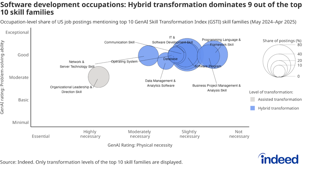 Full transformation, then, remains more of a theoretical ceiling than the current norm. […] What we are witnessing now is not a temporary phase; it’s the structural shift that underpins how GenAI is beginning to rewire the DNA of jobs. Hybrid transformation is not a bridge to full transformation — it is, for many roles, the destination.